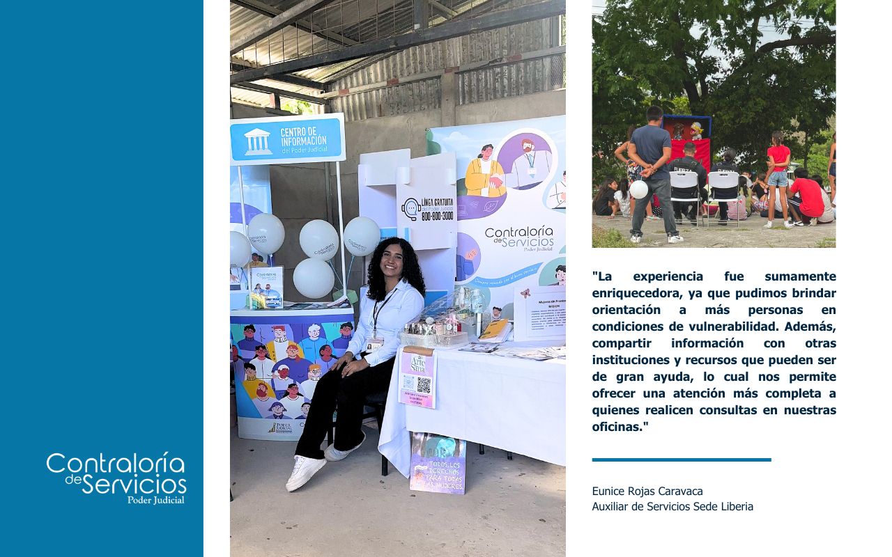 El pasado 25 de octubre de 2024, en el salón multiusos del Barrio Martina Bustos de Liberia, se llevó a cabo una feria informativa interinstitucional que fue coordinada por el Instituto Nacional de las Mujeres (INAMU) y la Comisión Regional para la Promoción de Derechos de las Personas Migrantes. En dicho espacio se contó con la participación de distintas instituciones públicas como también de otros organismos de cooperación, haciendo posible que las personas que se acercaron a los stands se informaran sobre diferentes temas impartidos por Fuerza Pública, PANI, Ministerio de Trabajo, Dirección General de Migración y Extranjería, ACNUR, HIAS, Mujeres sin Fronteras, entre otras. Asimismo, para todas aquellas personas menores de edad asistentes, se efectuaron actividades lúdicas y educativas para su sana recreación tales como elaboración de marionetas, pintas caritas, además de charlas relativas a educación sexual y acciones en contra del bullying en centros educativos, En representación del Poder Judicial, la Contraloría de Servicios del I Circuito Judicial de Guanacaste se hizo presente con un stand informativo que estuvo a cargo de la compañera Eunice Rojas Caravaca, auxiliar de dicha oficina. Los contenidos que estuvieron a disposición de los asistentes se asociaron a temas relacionados con los derechos de las personas migrantes, así como también sobre el acceso a servicios institucionales tales como apersonamientos a procesos judiciales, trámites de pensión alimentaria, uso de Gestión en Línea y aplicación móvil PJ. Luego de su participación, Eunice Rojas comentó: “La experiencia fue sumamente enriquecedora, ya que pudimos brindar orientación a más personas en condiciones de vulnerabilidad. Además, compartir información con otras instituciones y recursos que pueden ser de gran ayuda, lo cual nos permite ofrecer una atención más completa a quienes realicen consultas en nuestras oficinas”. Al ser parte de estos espacios interinstitucionales, la Contraloría de Servicios refuerza su compromiso de velar por los intereses ciudadanos y de actuar como un puente confiable entre las personas usuarias y el Poder Judicial. Con esto se busca promover un dialogo constante para la construcción de una administración de justicia más inclusiva y cercana para toda la sociedad costarricense. |