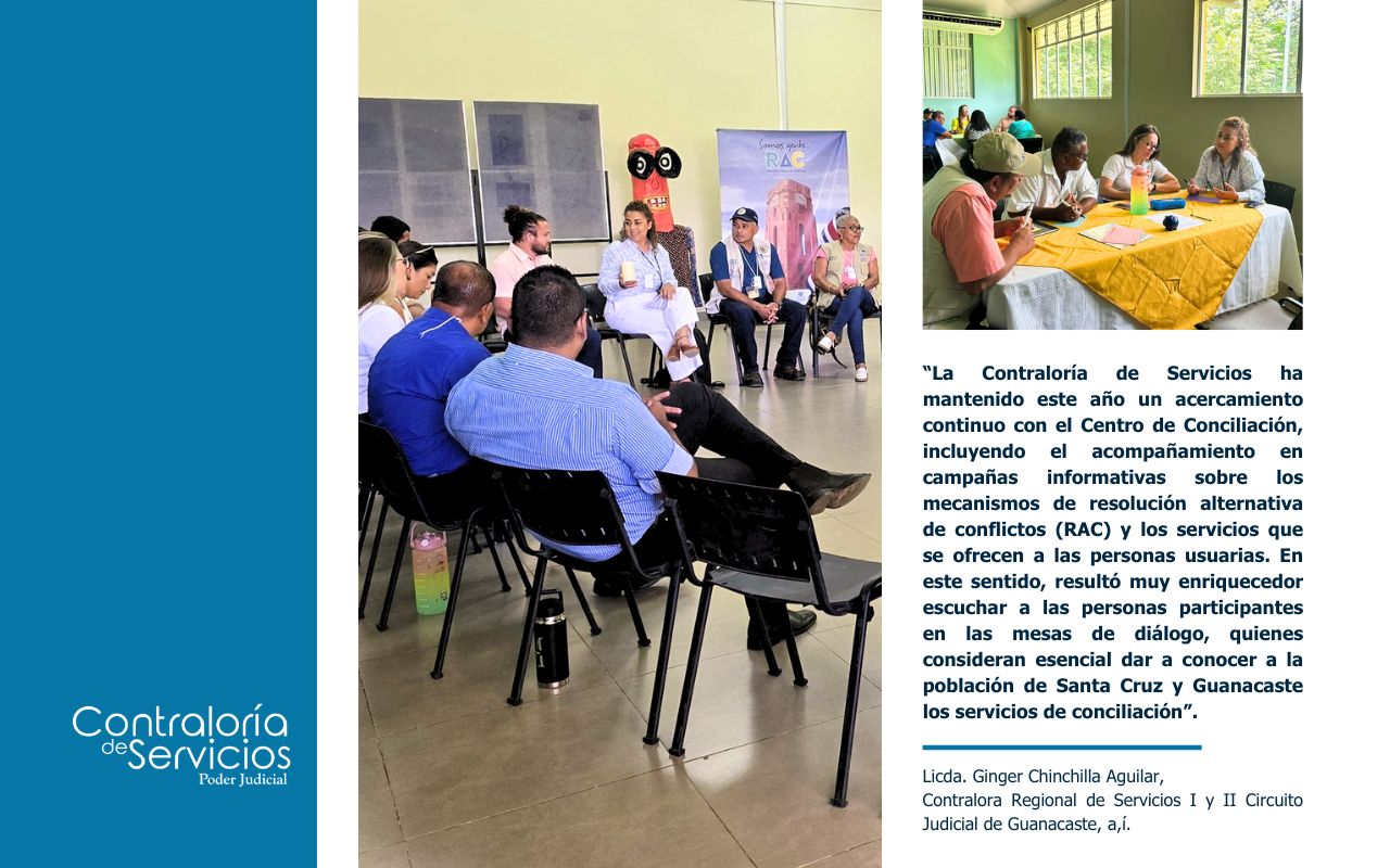 “La Contraloría de Servicios ha mantenido este año un acercamiento continuo con el Centro de Conciliación, incluyendo el acompañamiento en campañas informativas sobre los mecanismos de resolución alternativa de conflictos (RAC) y los servicios que se ofrecen a las personas usuarias. En este sentido, resultó muy enriquecedor escuchar a las personas participantes en las mesas de diálogo, quienes consideran esencial dar a conocer a la población de Santa Cruz y Guanacaste los servicios de conciliación”.