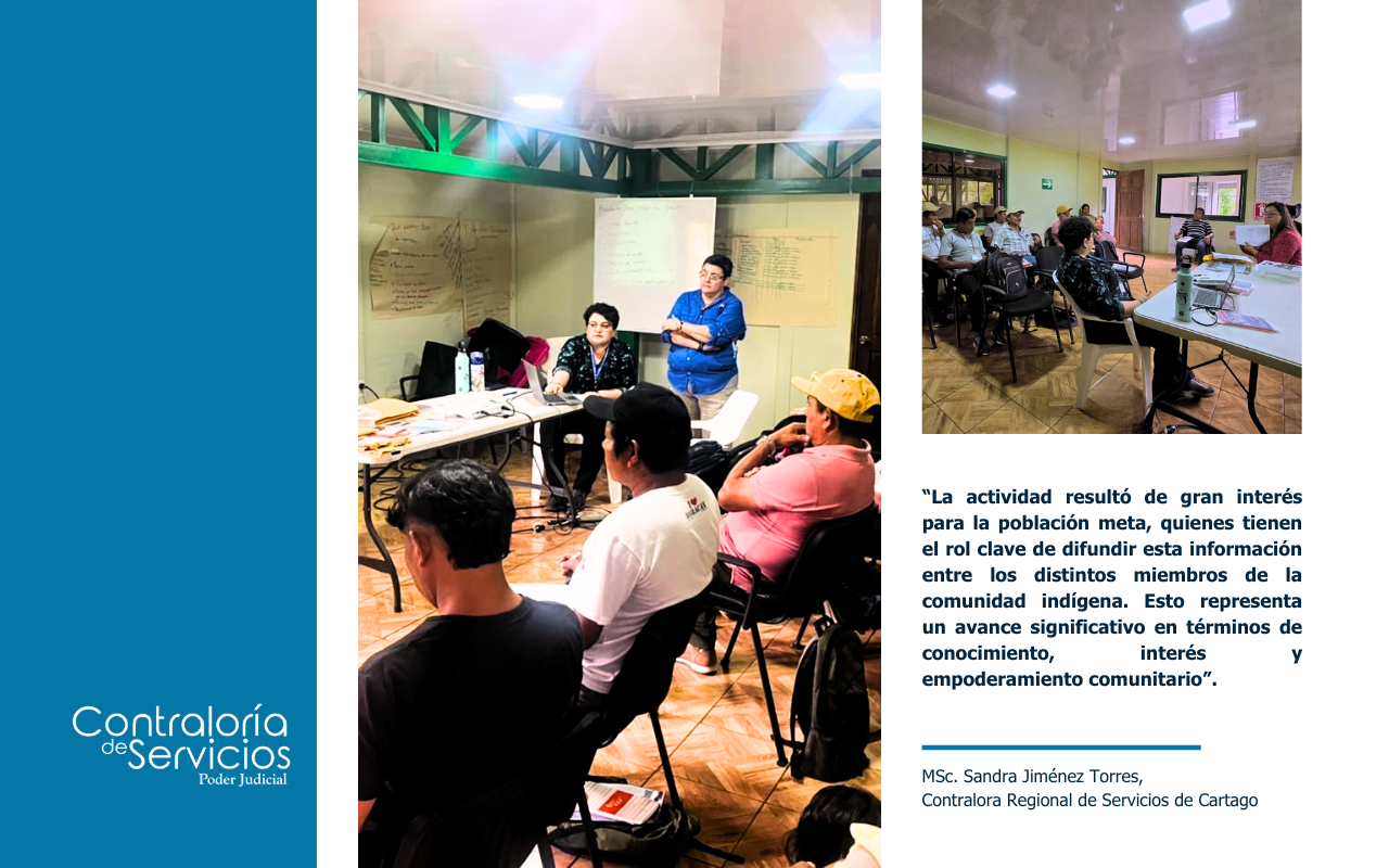 La capacitación fue impartida el viernes 20 de junio de 2025 En el marco del Servicio Nacional de Facilitadores y Facilitadoras Judiciales del Poder Judicial Luis Paulino Mora Mora, se desarrolló una jornada en el Centro de Acopio del Territorio Indígena de Grano de Oro, en la zona de Turrialba. La actividad fue organizada por personal del Juzgado Contravencional de Turrialba, en coordinación con la Contraloría de Servicios de Cartago, como parte de las visitas periódicas que se efectúan en la zona para la realización de diligencias in situ. Durante el encuentro, la jueza del Juzgado Contravencional de Turrialba, Licda. Eimy Granados, expuso sobre aspectos fundamentales de la violencia doméstica. Asimismo, la fiscala de Turrialba, Licda. Karen Mora, abordó temas relacionados con los delitos sexuales, el acoso callejero y otras manifestaciones de violencia. La capacitación fue solicitada por lideresas comunales indígenas, quienes identificaron la necesidad de fortalecer el conocimiento sobre estos temas dentro de las personas pobladoras de la comunidad. La participación activa del grupo de las personas facilitadoras judiciales evidenció un notable interés en comprender las diferencias entre los tipos penales y las acciones asociadas a la violencia intrafamiliar, un tema que históricamente ha sido considerado tabú dentro del contexto cultural del territorio. La señora María Ortíz Sanabría, lideresa de la comunidad, destacó que la capacitación fue de mucho provecho para los participantes y que les gustaría continuar siendo partícipes de más actividades de este tipo. Por otra parte, en palabras de la MSc. Sandra Jiménez Torres “La actividad resultó de gran interés para la población meta, quienes tienen el rol clave de difundir esta información entre los distintos miembros de la comunidad indígena. Esto representa un avance significativo en términos de conocimiento, interés y empoderamiento comunitario”. El programa de personas facilitadoras judiciales es coordinado por la Comisión para el Mejoramiento de la Administración de Justicia (CONAMAJ) y tiene como objetivo acercar el sistema de justicia a las poblaciones más vulnerables y promover el acceso equitativo a la información jurídica. ![]() |